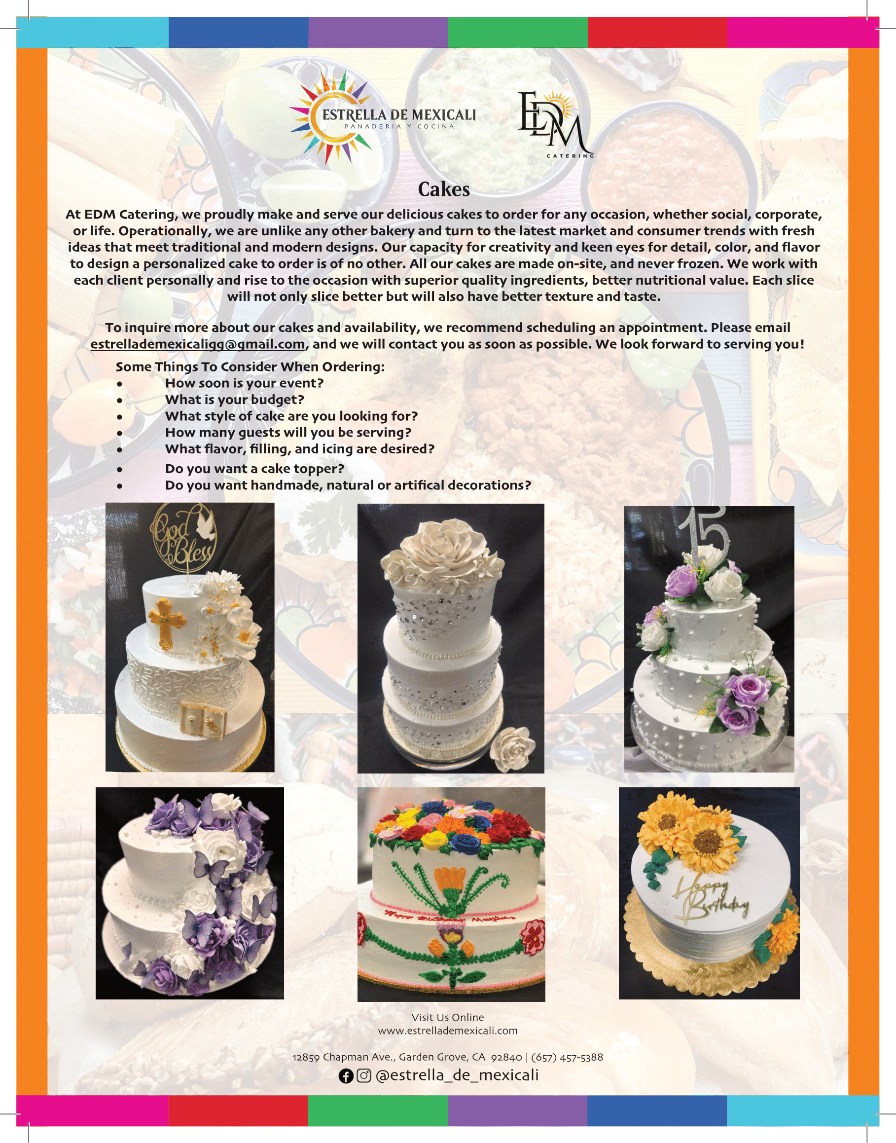 At Estrella De Mexicali, we proudly make and serve our delicious cakes to order for any occasion, whether social, corporate, or life. Operationally, we are unlike any other bakery and turn to the latest market and consumer trends with fresh ideas that meet traditional and modern designs. Our capacity for creativity and keen eyes for detail, color, and flavor to design a personalized cake to order is of no other. It takes a dedicated team to know how to get it done! All our cakes are made on-site, meaning we do not outsource or freeze cakes. We work with each client personally and rise to the occasion with superior quality ingredients, meaning better nutritional value. Each slice will not only slice better but also have better texture and taste. We only produce in batch quantities for the freshness you deserve.